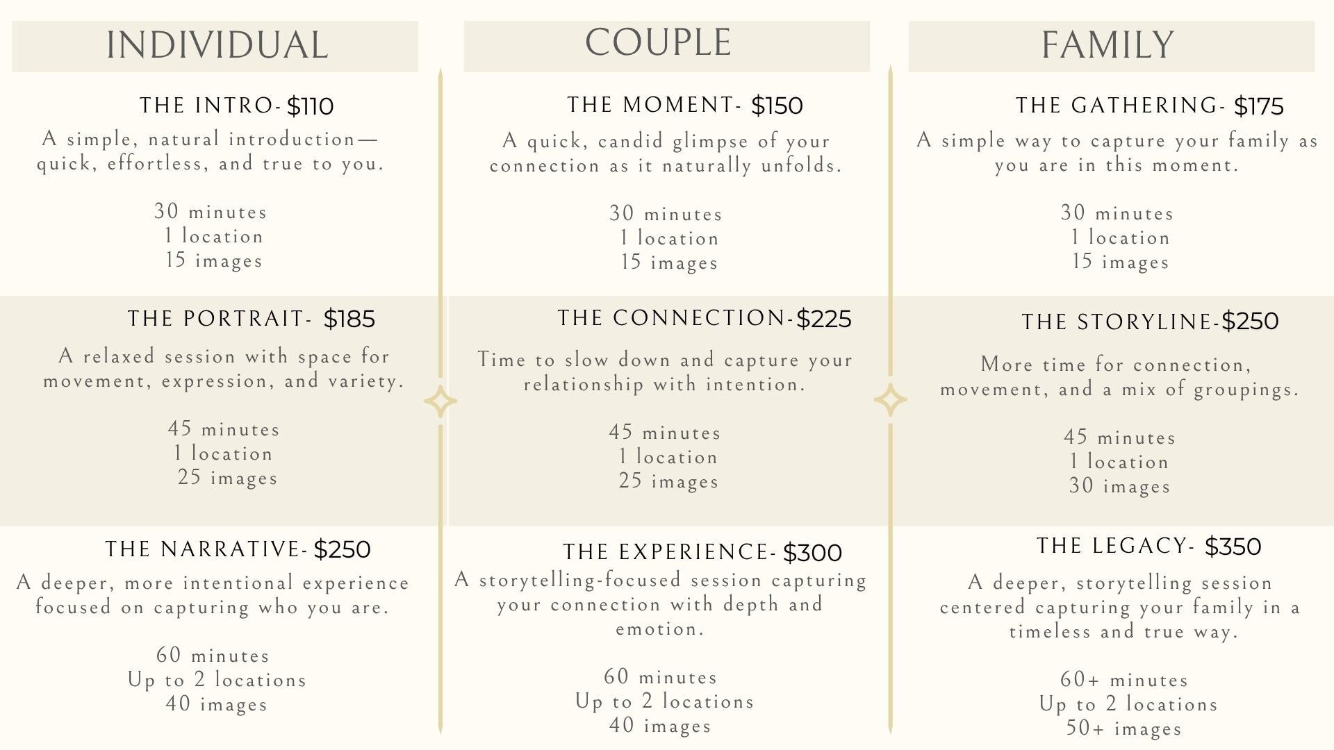 I offer a range of session options to accommodate individuals, couples, and families. My approach is centered on listening and responding thoughtfully, with packages designed to feel flexible rather than prescriptive.