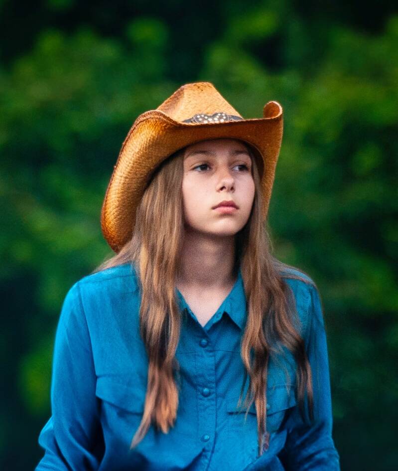 A cowgirl looks on in concentration as she waits for her turn before the event.