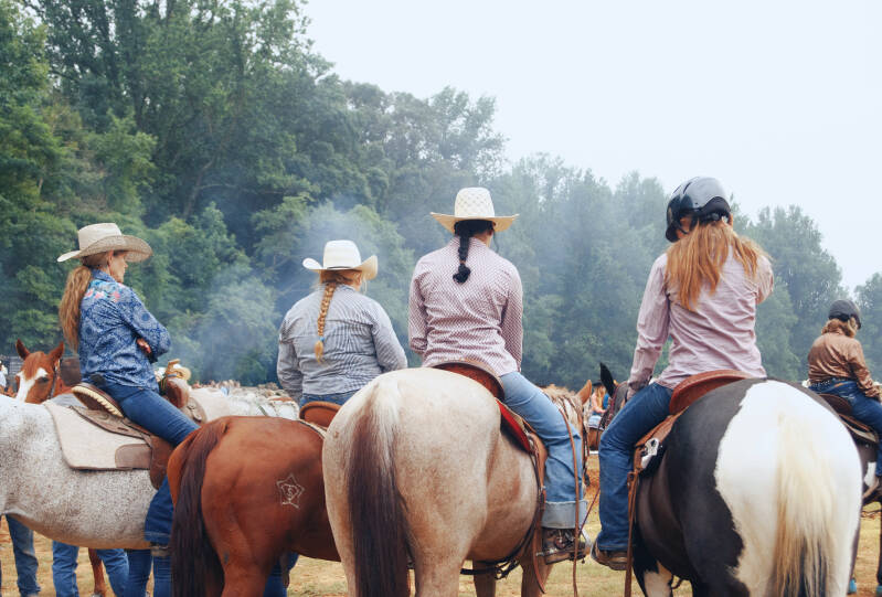 A lead rider guides the group out of the pen, setting the pace as the procession moves into the arena and signals the start of the event.