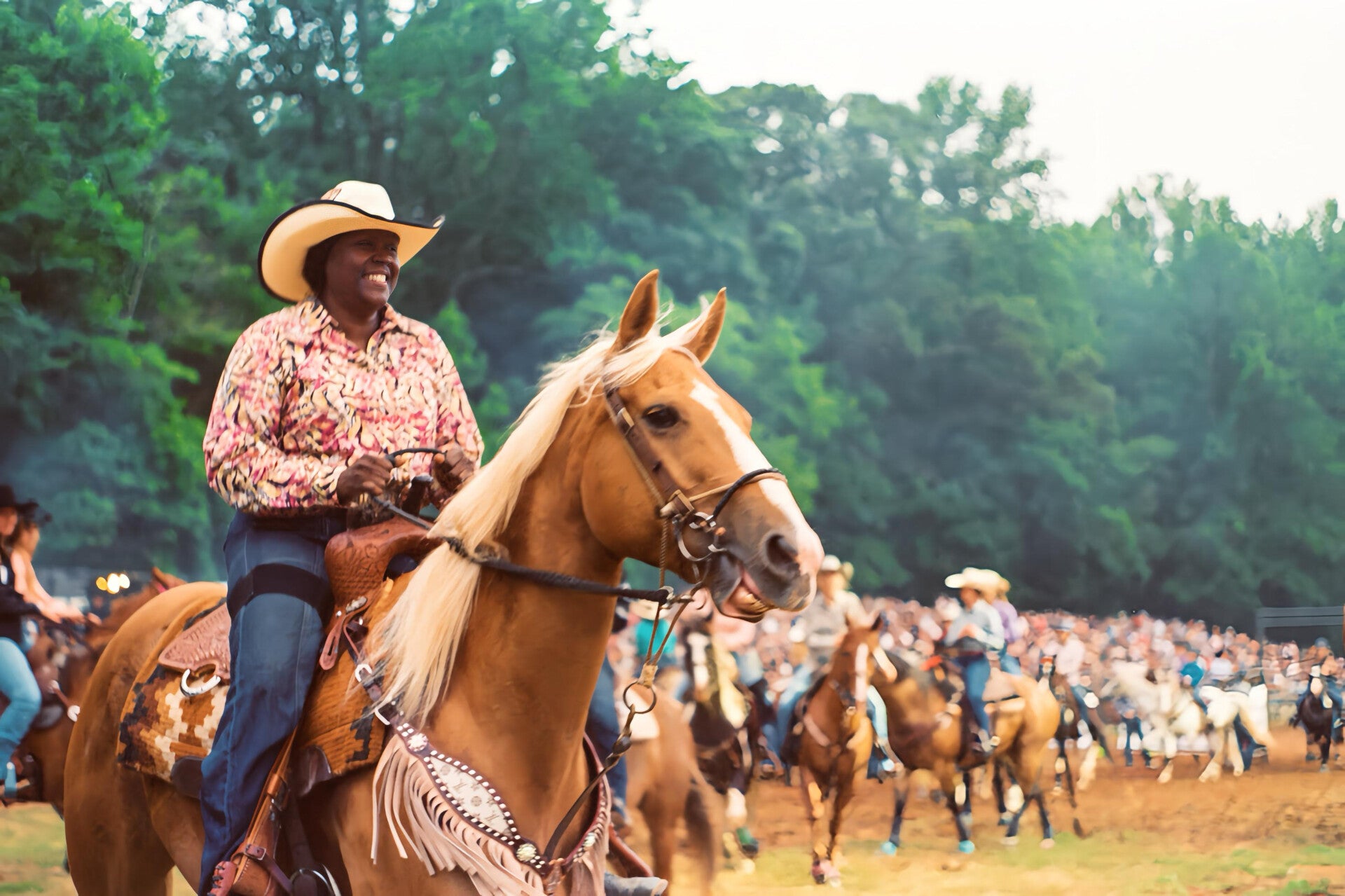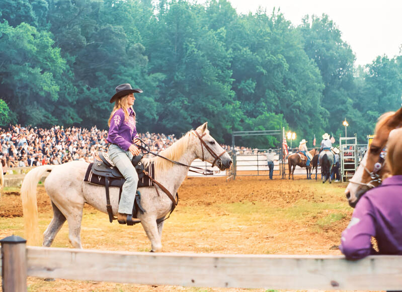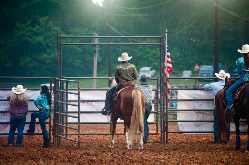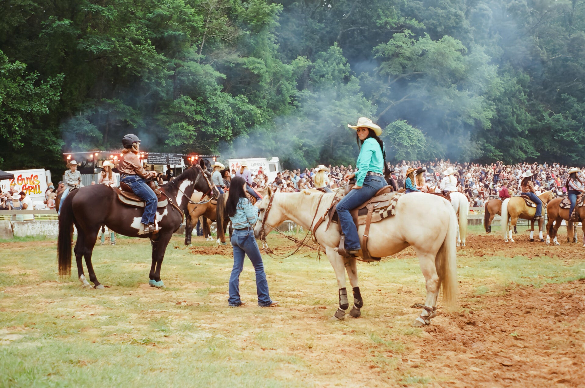 Riders wait at the edge of the arena as the crowd gathers—anticipation thick in the air.