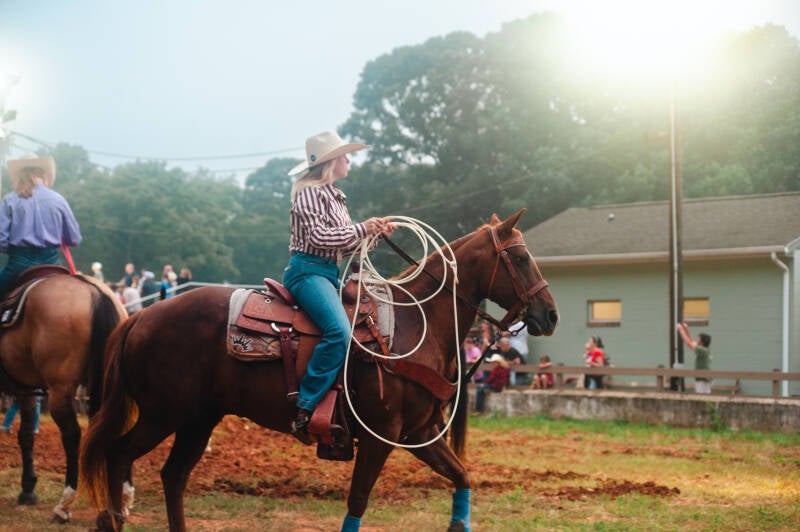 A cowgirl warms up her horse along the arena rail ahead of competition.
